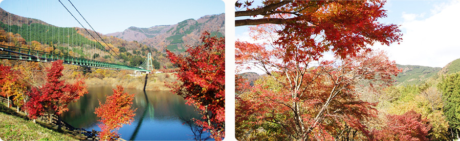 塩原ダム湖に架かるもみじ谷大吊橋は全長320メートルで無補剛桁歩道吊橋としては、本州最大級の長さを誇ります。橋の上から雄大な塩原渓谷の流れや景色を見ることができます。特に紅葉時期の景観は美しく11月上旬〜中旬に見ごろを迎えます。